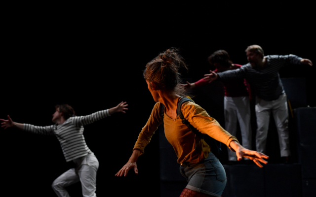 Le travail précis des corps à l’approche chorégraphique est porté par quatre interprètes, deux hommes et deux femmes. Mu est jouée par une danseuse, les trois comédien.ne.s investissant des changements costumes très rapides sont des parents, des oies humaines, des habitants des cases, une galerie chatoyante et trépidante autour de l’enfant, un parcours semé d’embuches et quelques belles rencontres.